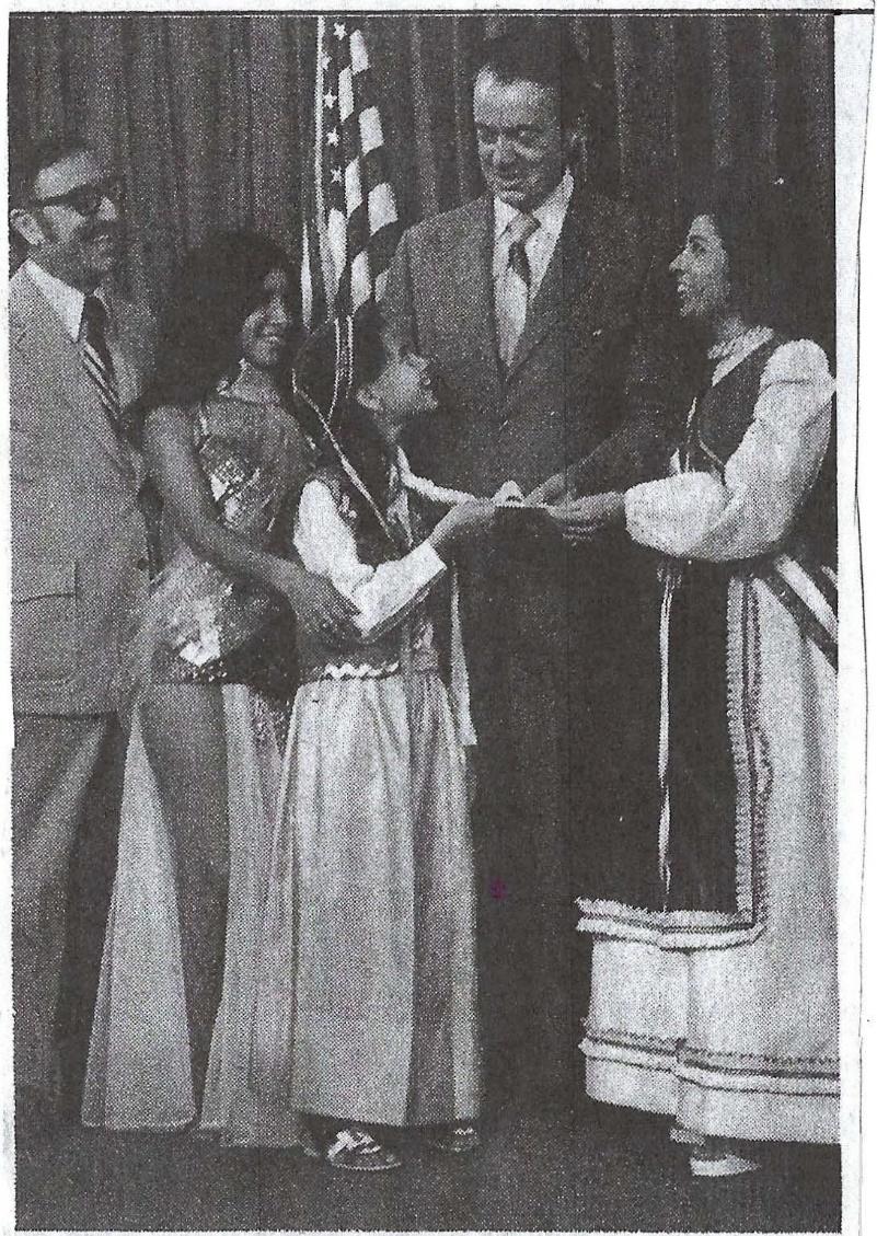 Joseph W. Alton, Jr. is presented with a program describing events to take place at the International Festival to be held at Sandy Point Park. Alton officially proclaimed September 18-24 International Week in Anne Arundel County. Representatives of the festival are from left, George Coutros, Chairman of the festival; Maria Samaras, an entertainer; Jane Papdemetriou wearing a traditional Greek folk dress; and Palma Tripodi in traditional Italian dress. The festival is being presented by the United Greek Orthodox Charities.