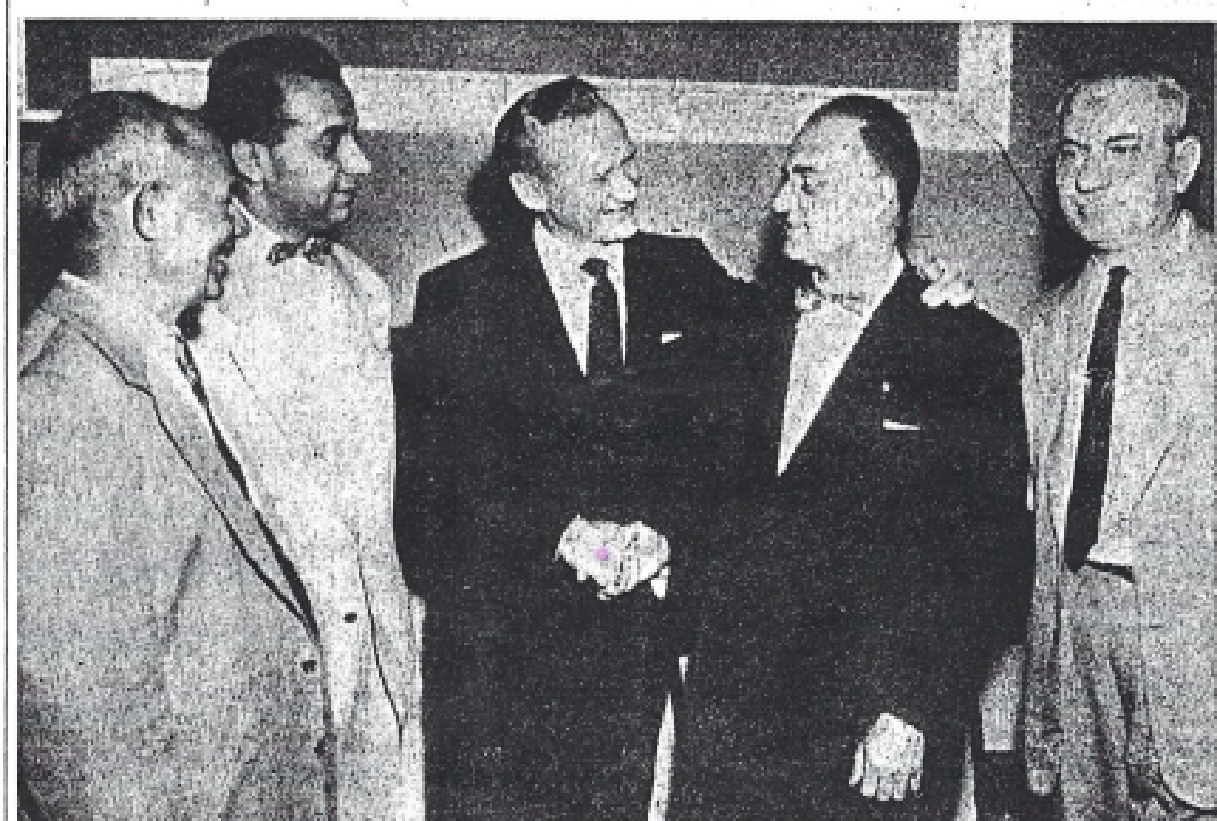Sammy Kalye played for the famed “Swing and Sway”. Kaye, the orchestra leader, poses here with officers of the Greek Community who arranged his appearance here at St. Mary’s auditorium. From left to right are Nicholas J. Mandris, member of the board of directors; Peter Palaigos, Secretary; Savvas Pantelides, President, and another member of the board. Absent when the picture was taken were John Kallis, Vice-president and Thomas Siomporas, Treasurer.