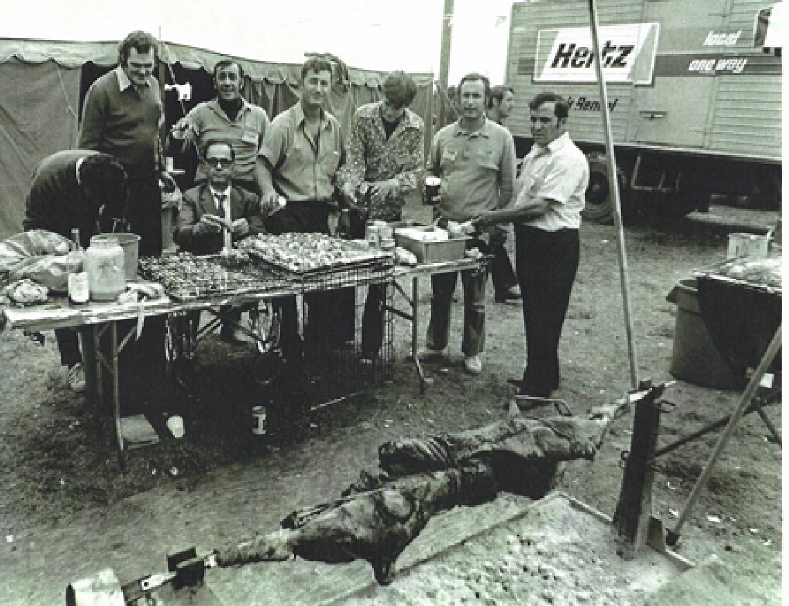 John Kallis, George Hadjis, Mike Kokkinos, Doug Cosgrove, and John Kyriacou roasting lamb