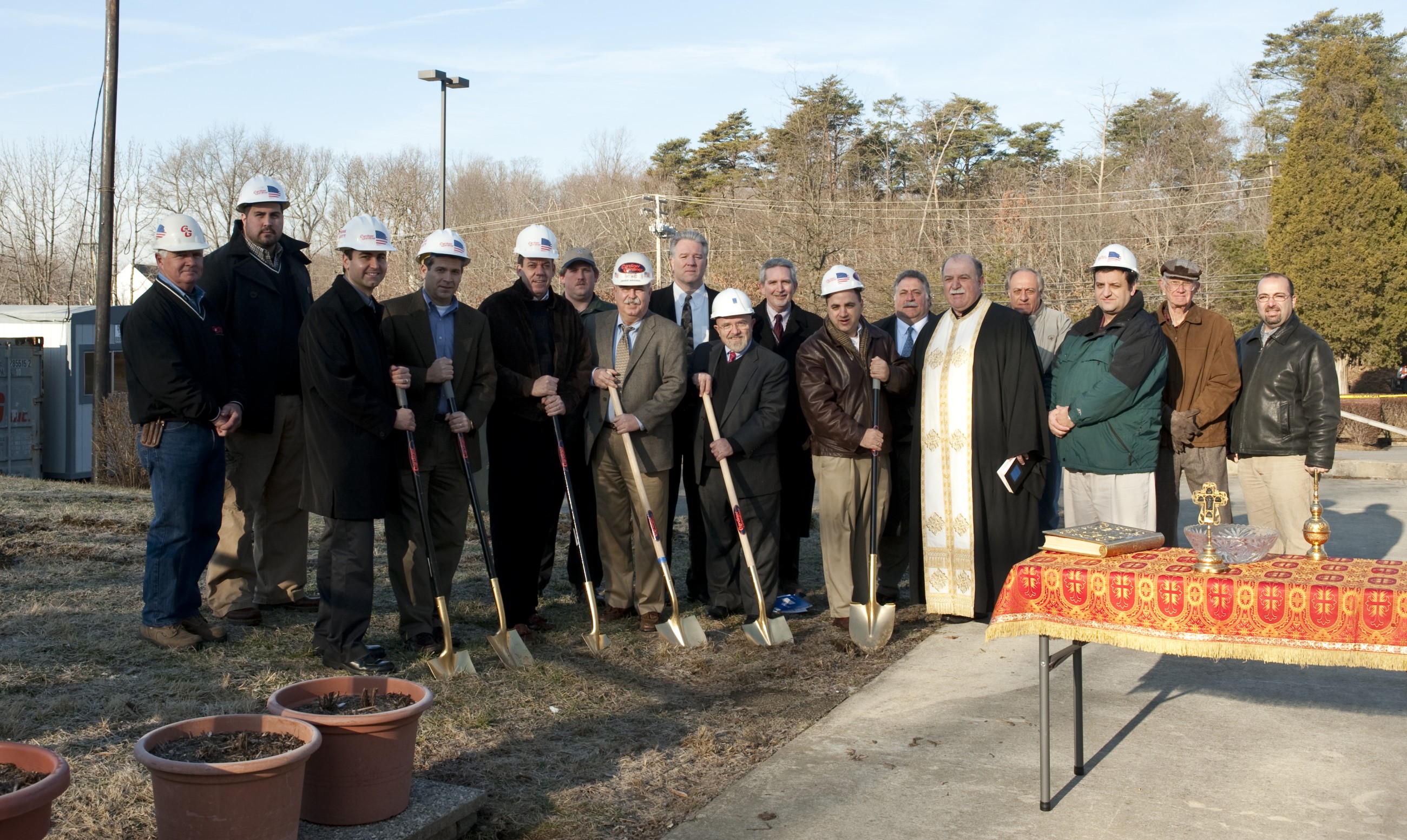 Left to Right Contractors Gardiner and Gardiner, Building Co Chair Brian Mcnamara, Leo Boone, Dimitri Sfakiyanudis, Peter Vezeris, Marcus Chacona, John Gramates, Father Kosmas Karavellas, Perry Koustenis, George Papaspyrou, Aurthur Bond Tayman, Kyricos "Jack" Papaleoniti